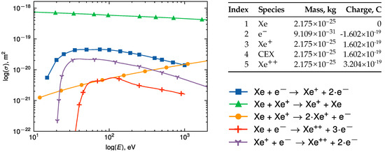 The plasma simulation includes five species and reactions: an overview of each individual species and reaction is given in Figure 7. From the preceding DSMC simulation, the neutral gas background density is used in order to avoid direct collision modeling of charged particles with neutral particles since . However, collisions with the background gas are still considered using a cross-section database, where for each time-step, artificial neutral particles are created from the background gas and paired with other ions, while electron–neutral collisions are modeled with an elastic-cross-section-based collision probability approach (see [26] for details).