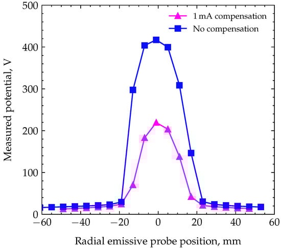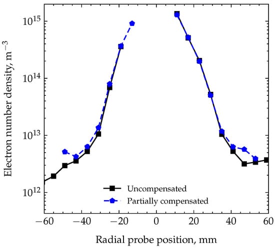 The radial profiles for the electron density at a distance of mm taken inside the beam with and without partial compensation are shown in Figure 12. No significant difference can be observed in the diagram. The points inside the beam show remarkably good repeatability, taking into account that the curves were taken on different days. The absence of the plasma density dependence on the compensation degree shows that the quasineutrality of the plume plasma is established automatically. Thermionic compensation can only change the ratio of the beam neutralization by SEE. This manifests in the reduced value of the potential jump during beam disturbance—the SEE has to be increased by a smaller degree due to the presence of a thermionic electron source.