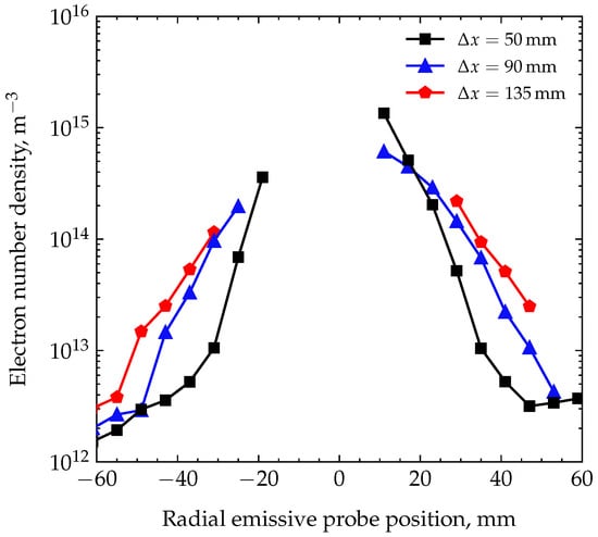 The values of electron density profiles measured with the Langmuir probe are shown in Figure 10. The measurements are located within the range of 2 × 1012 to 2 × 1015 m−3. Missing data points in the center of the beam arise due to the limited range of the measurement device, which was not able to compensate for the sudden increase in the voltage range. The ionic parts of the VCC could not be collected in these radial positions.