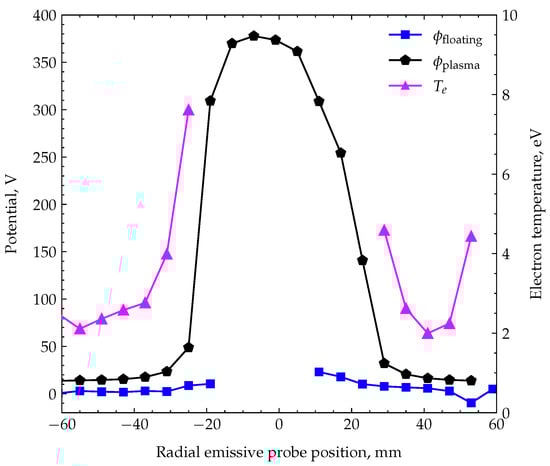 The data in Figure 11 reveal that the potential jump has an influence on the determination of the electron temperature. The plasma potential measured with the emissive probe has a broader profile than the floating potential measured with the Langmuir probe. This is due to the fact that between both measurements, the probe holder should be moved 40 mm away from the thruster. The divergence of the ion beam results in a slightly different width of the disturbance introduced by the probe system in the axial positions separated by 40 mm. The electron temperature depends on the absolute value of the plasma and floating potentials, and this slight difference results in severe uncertainty about electron temperature determination inside the beam. Thus, the electron temperature can be reliably determined with our setup only outside of the ion beam. The reliably measured values lie within a range of 1.5 to 5 eV. The measured value of 8 eV at mm is questionable due to the reasons stated above. For the correct determination of inside the ion beam, the plasma and floating potentials should be measured under identical disturbances. One possibility for such measurement lies in using a two-probe arrangement, with the probes entering the beam successively. The second probe enters the beam after the first one has already left it. If the distance between emissive and Langmuir probes is bigger than the beam diameter, then each probe will introduce the same disturbance and the values of plasma and floating potentials can be used for the determination of electron temperature. This measurement lies within the scope of future work.