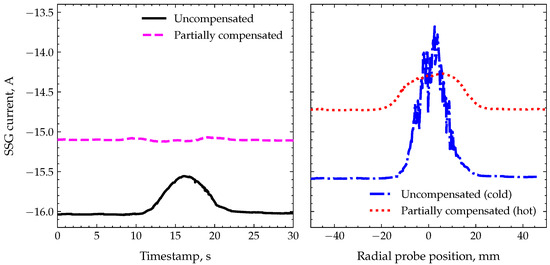 Comparison of SSG currents in different situations. Left—the first probe is mm from the thruster and has an uncompensated vs. partially compensated beam. Right—the first probe is mm from the thruster and has a partially compensated beam with hot cathode vs. an uncompensated beam with cold cathode.
