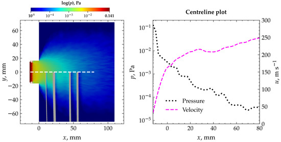DSMC results of neutral gas with probes located inside beam. Left—contours of pressure, with centerline indicated by white dashed line. Right—centerline plot of pressure and velocity.