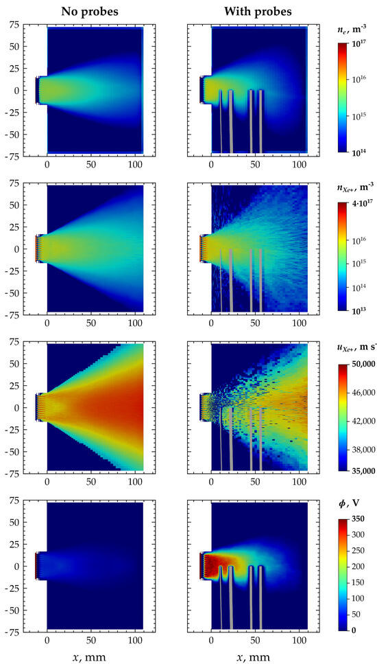 In Figure 15, contours of plasma properties are outlined for both the disturbed and undisturbed cases. In general, it is observable that the beam divergence is larger in the disturbed case, which can be seen in the contours of the ion number density. The electron number density indicates more electrons being located between the thruster’s exit region and the first probe. Furthermore, the (scaled to 3.5 × 104 to 5 × 104 m s−1) contours of ion velocity demonstrate that ions lose kinetic energy in front of the probes, hinting at an increase in the electric potential in this region. This premise is confirmed by the contours of potential, which illustrate a significantly higher potential of more than 350 V in the disturbed case compared to a few tens of volts in the undisturbed case.
