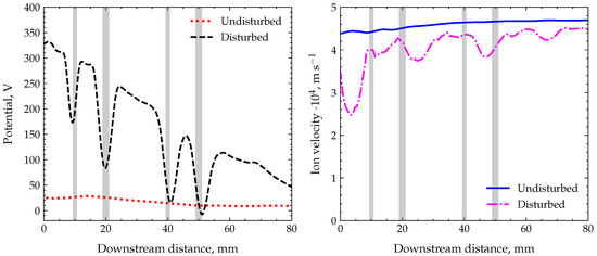 Left—comparison of downstream potential . Right—comparison of ion velocity . Disturbance of the neutralization process of the ion beam results in a significantly higher potential and slow-down of the ions downstream. The grey-shaded regions indicate the (axial) location of the probes.