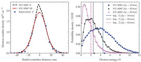 Finally, in order to validate the PIC-DSMC simulations, the radial electron number density and electron energy distribution function (EEDF) at an axial distance of mm is compared to the experimental measurements at different -positions. The results are displayed in Figure 17 and reveal that the simulation is able to predict both the radial profile of the electron number density distribution as well as the absolute values of number density (left panel). Examining the right panel, it is evident that there is good agreement when determining the electron temperature from the EEDF predicted by PIC-DSMC at each measurement point.