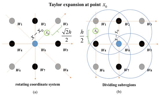 Figure 4 shows the Taylor expansions on both sides of the equation for the reconstructed difference operator using the Lagrange residue term form for the methods in this paper and those produced by Zhong et al., respectively, with Zhong et al.’s x0 being chosen to expand at the midpoint of the diagonal position. The value of x −x0 is therefore . The error brought into Equation (2) can be expressed as