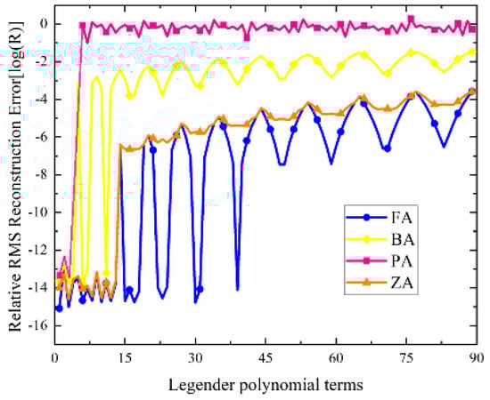 A comparison of the wavefront recovery reconstruction results for a signal-to-noise ratio of 10 considering noise is shown in Figure 7. As can be seen from the simulation results in Figure 7, in the presence of measurement noise, the present method introduces more integral loop points compared to existing algorithms in that there is a smaller relative reconstruction error for higher-order aberrations, as well as a stronger noise immunity. Compared to the PA and BA, the present algorithm introduces more reconstruction information, resulting in better noise immunity, and, compared to the ZA, the noise immunity remains basically the same due to the same amount of information being introduced.