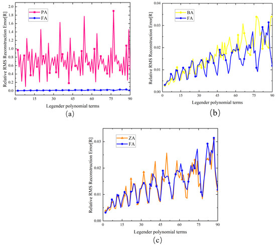 Comparison of the reconstruction error of each reconstruction algorithm for a signal-to-noise ratio (SNR) of 30: (a) PA and FA, (b) BA and FA, (c) ZA and FA.
