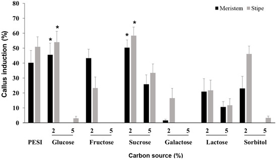- Martinez, M.E.; Jorquera, L.; Poirrier, P.; Díaz, K.; Chamy, R. Effect of the carbon source and plant growth regulators (PGRs) in the induction and maintenance of an in vitro callus culture of Taraxacum officinale (L.) Weber Ex F.H. Wigg. Agronomy 2021, 11, 1181. [Google Scholar] [CrossRef]