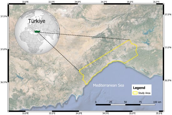 The study area is located between 34.0 and 35.1° E longitude and 36.5 and 37.1° N latitude. It has a surface area of 230,675.29 hectares, and is situated within the Mediterranean climate zone. The study area encompasses the central four metropolitan districts (Akdeniz, Yenişehir, Toroslar, and Mezitli) of the Mersin Province and two surrounding developing districts (Tarsus and Erdemli). The selection of these district boundaries was based on the historical direction of growth and population increase within the Mersin Metropolitan area, as well as their proximity to each other. Additionally, significant changes in LULC patterns had been predominantly observed among these districts over time. Administrative district boundaries were considered when delineating the east–west boundaries of the study area. For the northern boundary of the area, a distance of 15 km from the coastline was utilized, disregarding the Taurus Mountains (Figure 1).