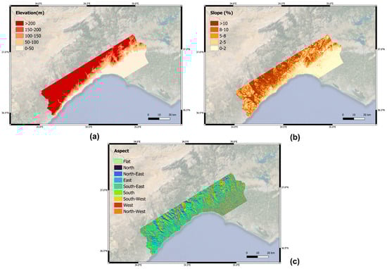 (a) Elevation, (b) slope, and (c) aspect maps of the study area.