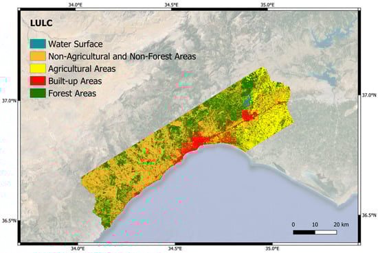 In determining urban development and settlement, numerous attractive forces exist, and one of these criteria is LULC. LULC changes that contribute to urban development and non-urban land cover around the city need to be examined in urban suitability analysis [27]. In this context, the inclusion of the current LULC data set is essential for this analysis. In this study, the ‘World Cover 10 m 2021’ product from the European Space Agency was utilized. This product provides a global LULC map for the year 2021 with a spatial resolution of 10 m, based on Sentinel-1 and Sentinel-2 satellite data [28]. The map shown in Figure 3 illustrates a clipped version of the ESA World Cover data set for our study area, generalized with five LULC classes. The rationale for this generalization was the need to produce classes consistent with the satellite image classification work conducted in the subsequent sub-sections. These five LULC classes include water surfaces, non-agricultural and non-forest areas, agricultural areas, built-up areas, and forest areas.