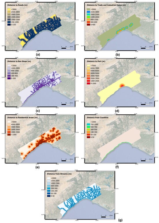 (a) Distance to road networks, (b) distance to trade and industrial zones, (c) distance to bus stops, (d) distance to port, (e) distance to residential areas, (f) distance from the coastline, and (g) distance from streams.
