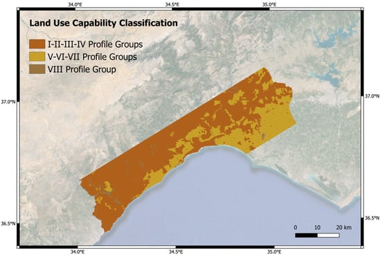 Urban planning is influenced by the condition of soil (land use) capability, which is one of the fundamental constraints related to site selection. In this study, official ‘Land Use Capability Classification’ maps were used for the soil capability criterion. These maps consist of eight separate categories, each indicated by Roman numerals (I, II, …, VIII) Within the framework of the land use capability classification system, classes I to IV delineate land suitable for agricultural purposes, denoting its capability for crop cultivation. As the classification ascends from Class I to Class IV, there is a corresponding increase in the constraints imposed on land use and the requisite conservation measures. Conversely, Classes V to VIII encompass lands deemed unsuitable for agricultural cultivation. However, this designation does not imply a lack of land use. Rather, lands classified within these categories may find application in activities such as pastureland management, urban development, recreational pursuits, and aesthetic enhancement [31]. Figure 5 presents the soil capability map of the study area. In this map legend, soil capability is grouped into three classes. Classes from I to IV are considered absolute agricultural land, classes from V to VII are categorized as marginal agricultural land, and Class VIII is classified as unsuitable for agriculture.