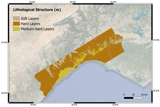 The lithological structure of land is a significant criterion for suitability analysis in urban settlement. It influences construction on the land and plays a crucial role in determining the direction of development [32]. Especially considering the seismic risks in Turkey, including lithology data in the analyses for identifying suitable lands for urban settlement can assist in minimizing potential damage in cities prone to experiencing natural and human-made disasters. Geological data from the General Directorate of Mineral Research and Exploration (MTA) were used to classify the lithological structure of the study area. The study area comprised 24 distinct lithological layers categorized into three groups based on their hardness: soft, medium hard, and hard layers. Soft lithological structures included tuff, gypsum, olistostrome, shale beach, schist-chalk schist, sand dunes, alluvial fan, and melange. Medium hard lithological structures encompassed scree-debris, cones, caliche-terrace, quartzite–quartz system, sandstone–mudstone, and caliche layers. Hard lithological structures consisted of ophiolitic rock, limestone, marble, sandstone–mudstone, travertine, clayey limestone, sandstone–mudstone–limestone, conglomerate sandstone–mudstone, conglomerate limestone, and gravel–sandstone. The classification process utilized the Mohs hardness scale and expert opinions [33]. Figure 6 presents the lithological structure map of the study area.