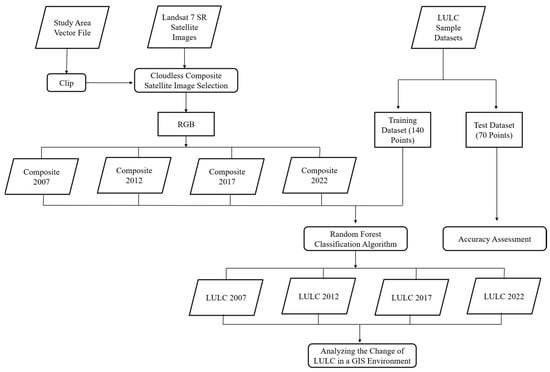 In this study, Landsat 7 images were used for temporal analysis of LULC area changes. Cloud-free and snow cover-free composite images at five-year intervals (2022, 2017, 2012, and 2007) for the spring and summer months were compiled from atmospherically corrected reflectance (SR) Landsat 7 images with a 30 m spatial resolution on the GEE catalog (Path: 175–174, Row: 35–34). A vector file (.shp) delineating the study area boundaries was uploaded to the GEE platform. The classification analysis utilized the normalized difference vegetation index (NDVI), the normalized difference built-up index (NDBI), and combinations of natural color (RGB) spectral indices, with preliminary findings indicating the highest classification success from the RGB composite images.