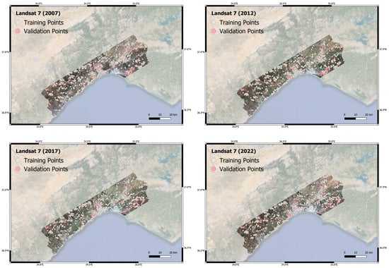 The classification process aimed to assign each pixel to the appropriate LULC class automatically. However, for supervised image classification, samples of relevant LULC classes need to be provided as training data to the classifier algorithm. Marking selected LULC classes on the images is a prerequisite for training supervised classification algorithms [19]. Therefore, a total of 840 pixels were labeled on images for each year, with 140 pixels randomly distributed for training and 70 pixels for testing per class. These pixels were equally distributed among the five LULC classes. The selected training pixels were used to train the classifier, while the remaining test pixels were used to evaluate the classifier’s performance [37,38]. These pixels were chosen through a visual method enhanced by high-resolution images from Bing and Google Earth, L7 NDVI profiles, false color composites, and local LULC maps. Figure 8 displays the training and test pixels associated with each image composite.