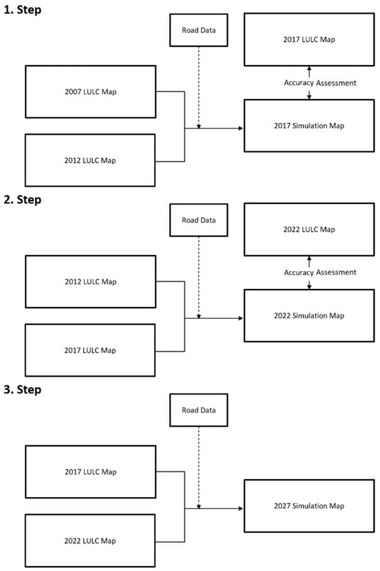 For the creation of urban growth simulation, past data on LULC classes is required. The input data for urban growth simulation consists of LULC maps from the years 2007, 2012, 2017, and 2022, along with road network data. The road network map, converted from vector to raster format with a 30 m resolution, was compatible with the LULC maps. The reason for using only the road network during simulation is that the analysis of built-up area changes over the years in Mersin indicated that the road network was the most significant factor influencing urbanization. Urban growth simulations were generated for the year 2017 based on the LULC maps from 2007–2012, for 2022 based on the maps from 2012–2017, and for 2027 based on the maps from 2017–2022. The simulation process is illustrated step by step in Figure 9.