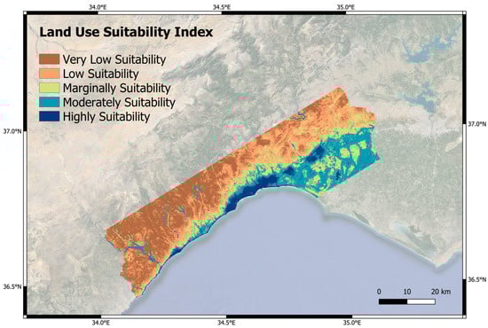 Subsequently, each layer was overlaid to obtain the urban land use suitability index map. In this map, the suitability values of pixels were classified into five categories (very low, low, marginally, moderately, and highly suitable) using the natural breaks method (Figure 10).
