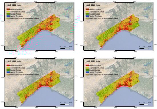 LULC maps derived from image classification with RF classifier: 2007 (upper left), 2012 (upper right), 2017 (lower left), and 2021 (lower right).