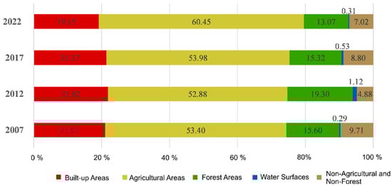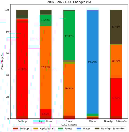 Between 2007 and 2022, 91.01% of the built-up areas in the study area remained built-up. In comparison, 76.72% of agricultural areas were preserved, with 8.60% converting to built-up areas, 10.42% to forest areas, 0.05% to water surfaces, and 4.21% to non-agricultural/non-forest areas. Of the forest areas, 47.05% were preserved, with 49.34% converting to agricultural areas, 2.87% to built-up areas, 0.07% to water surfaces, and 0.67% to non-agricultural/non-forest areas. Of the water surface areas, 95.26% were preserved, with 1.22% converting to built-up areas, 1.11% to agricultural areas, 2.18% to forest areas, and 0.23% to non-agricultural/non-forest areas. Of the non-agricultural/non-forest areas, 31.41% were preserved, with 37.55% converting to built-up areas, 30.73% to agricultural areas, 0.27% to forest areas, and 0.04% to water surfaces. A summary of all these changes is provided in Figure 14.