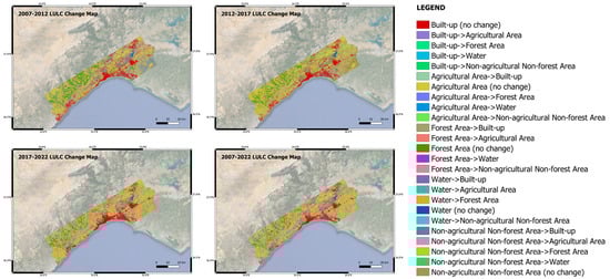 Separate maps were created to illustrate the changes in LULC classes over the years. These maps contain a legend of 25 classes representing the transition between five different LULC classes and no-change conditions. Figure 13 illustrates the LULC changes between 2007 and 2012 (upper left), the changes between 2012 and 2017 (upper right), and the changes between 2017 and 2022 (lower left). Furthermore, the lower right part provides an overview of LULC changes spanning the entire study period from 2007 to 2022.