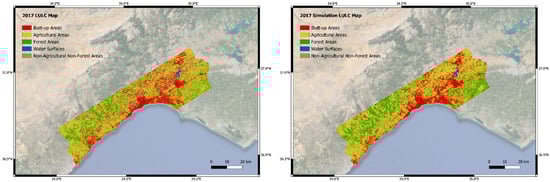 LULC maps obtained from the 2017 classification (left) and simulation (right).
