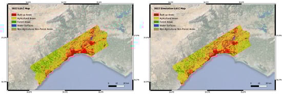 LULC maps obtained from the 2022 classification (left) and simulation (right).