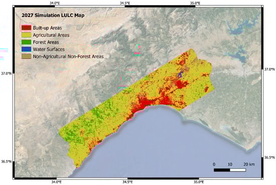 Due to the satisfactory overlap ratio obtained in the step-by-step simulation process, it was deemed appropriate to generate the LULC simulation for the year 2027 using the same technique. The LR algorithm trained from the LULC maps of 2017 and 2022 was used to obtain the simulated LULC map for the year 2027. The objective here was to quantitatively determine how LULC classes will change over the next five years in the Mersin Metropolitan Area and to depict urban expansion. The LULC map for the year 2027 obtained from simulation is shown in Figure 17. Table 9 presents the area covered by LULC simulation classes in 2027 and the proportion of the study area they occupy.