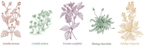 In this paper, we present a review of the state of knowledge, based on historical sources and the latest scientific reports, regarding the dermatological, cosmetic, and pharmacological properties of several interesting plants, such as Acmella oleracea (A. oleracea), Centella asiatica (C. asiatica), Psoralea corylifolia (P. corylifolia), Plantago lanceolata L. (P. lanceolata L.), and Solidago virgaurea L. (S. virgaurea L.) (Figure 1).