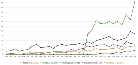 Annual number of publications (review and research articles) dealing with A. oleracea, C. asiatica, P. corylifolia, and P. lanceolata, S.virgaurea. The literature search was performed in the Scopus database for the years 1990–2020, (access on 20 December 2023).
