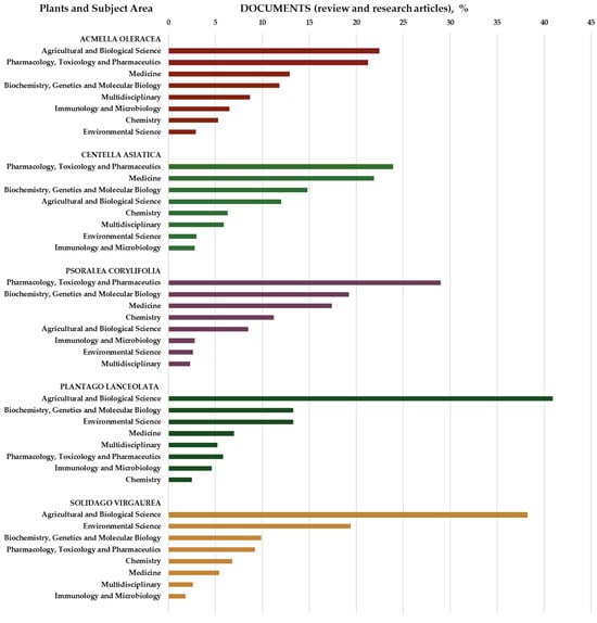 Documents by subject area dealing with A. oleracea, C. asiatica, P. corylifolia, P.lanceolata, and S. virgaurea. The literature search was performed in Scopus database, for the 1990–2020 period, (access on 20 December 2023).
