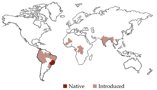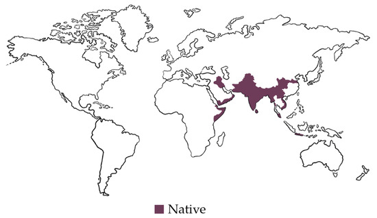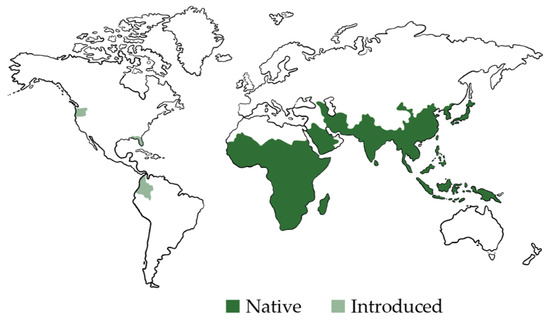 It is cultivated in tropical and subtropical regions of Asia. It also grows in Australia, South Africa, Madagascar, and in selected areas of North, Central, and South America. (Figure 6 and Table S1 in Supplementary Materials) [43].