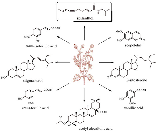 Plants of the Acmella genus are characterized by a high content of biologically active compounds, including N-alkylamides, vanillic acid, scopoletin, 3-acetylaleuritolic acid, trans-ferulic acid, trans-isoferulic acid, stigmasterol, and sitosterone (Figure 5) [14,16,17]. The most active N-alkylamide responsible for the biological properties and sensory effects of the plant (such as tingling, salivation) is (2E,6Z,8E)-N-(2-methylpropyl)-2,6,8-decatrienamide, commonly known as spilanthol (syn. affinin) [14,15,16,17,18,19,20,21,22].