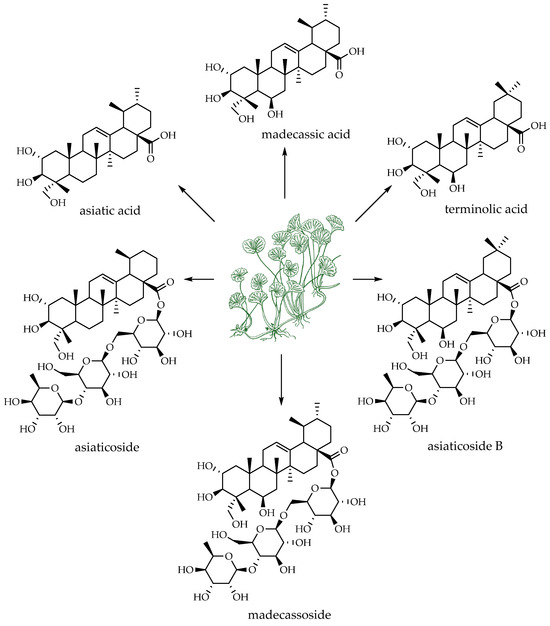 The most important bioactive ingredients from Centalla asiatica [42,48].