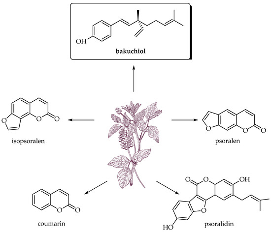 P. corylifolia L. is a source of many active substances such as meroterpenes, furanocoumarins, coumarins, flavonoids, and terpenoids, which belong to secondary metabolites (Figure 9). In 1973, Mehta for the first time isolated from this plant an active substance with a characteristic structure (IUPAC: 4-[(1E,3S)-3-ethenyl-3,7-dimethylocta-1,6-dienyl]phenol), which he named bakuchiol (syn. chiba, drupanol) [59,60]. The analysis of the chemical composition of extracts obtained from different parts of the plant showed that bakuchiol is present in all its parts and at every stage of its development, with its maximum amount found in the seeds [61].