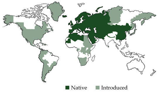 P. lanceolata L. grows wild as a weed among cultivated crops, especially alfalfa, clover, flax, and winter and spring cereals, in the northern hemisphere in the temperate climate zone. It proliferates abundantly in meadows, pastures, as well as lawns, and agricultural wastelands with black soil or loamy sandy soils [82]. This species originally comes from Europe, but now occurs in every corner of the world, e.g., in the USA, Australia, New Zealand, Japan, and many countries in Africa (Figure 10 and Table S1 in Supplementary Materials) [83].