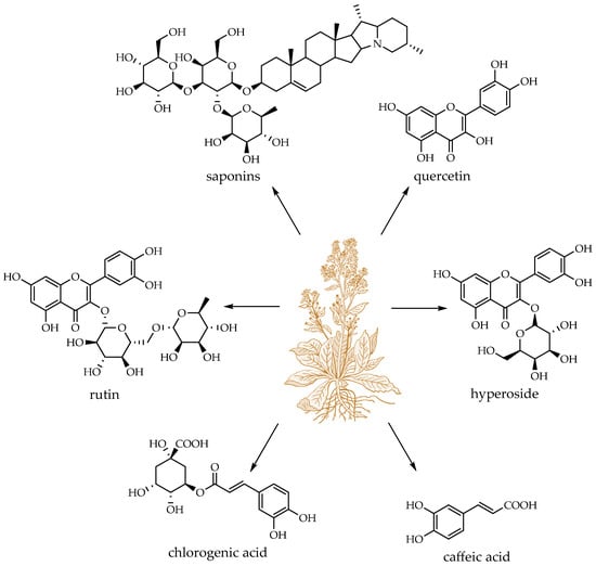 The medicinal properties can be assigned to each part of the plant, although leaves are most commonly used as a raw material. The extract obtained from the leaves of P. lanceolata L. mainly contains polyphenols, flavonoids (baicalein and scutellarein), tannins, alkaloids, terpenoids, organic acids (ascorbic, benzoic, cinnamic, fumaric, and vanillic acids), mucilaginous substances, pectins, and mineral salts (compounds containing silicon, zinc, potassium, and iron) [80]. The leaves are also a source of iridoid glycosides (aucubin, catalpol, globularin, and asperuloside), and propionic glycosides (verbascoside, plantamajoside, isoverbascoside, and lavandulifolioside) [91,92]. Phytochemical analyses of Plantago species also confirm the presence of derivatives of caffeic acid, coumarin, fats, and oils (Figure 11) [84].