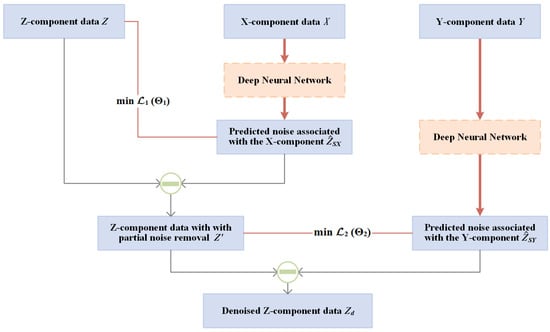 Naturally, in the second step, will be further denoised as the updated noisy data by repeating the above steps using Y-component data () as the reference noise model. After feeding into the network and optimizing the network parameters with Equation (7) as the loss function, the final denoised Z-component () can be reconstructed as follows: