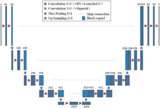 The network we used is based on U-Net. U-Net is a fully convolutional network, first proposed by Ronneberger et al. [], and widely used in various domains due to its outstanding generalization ability. The U-Net is composed of two parts: the contracting path, known as the encoder, is used for extracting features and context information; and a symmetric expanding path responsible for resolution restoration, which can be understood as a decoder. The features extracted by the encoder are incorporated together with the feature maps in the decoder through skip connections. Compared to the standard convolution neural network (CNN), U-Net uses skip connections so that the low- and high-level features of the input data do not decay inside network propagation. These architecture choices collectively contribute to the effectiveness of the U-Net. The structure of the U-Net network used in this paper is shown in Figure 2.