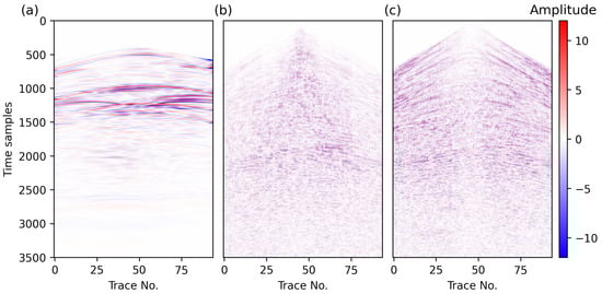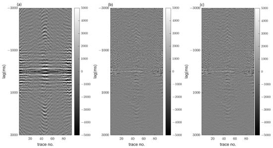 For field data, we cannot use SNR as a metric for evaluating the denoising results due to the unavailability of clean data. Inspired by Jeong and Tsingas [], we utilize the raw P-component data as a reference to evaluate the denoising results since the pressure wave recorded by a hydrophone is not disturbed by shear wave noise. Figure 9a shows the auto-correlation of P-component data used as a reference. Figure 9b shows a cross-correlation plot between the P-component and the raw Z-component, and Figure 9c shows a cross-correlation plot between the P-component and the denoised Z-component. Compared with Figure 9b, Figure 9c has a higher similarity with Figure 9a, which indicates that the proposed method effectively suppresses the shear noise while retaining the desired signal.