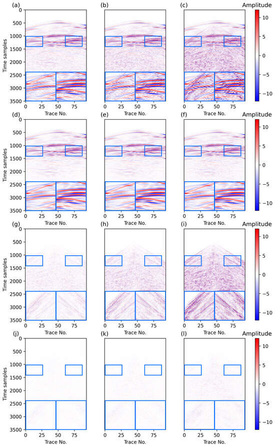 Synthetic data example. First row: noisy data of Dataset 1-1 (a), Dataset 1-2 (b) and Dataset 1-3 (c). Second row: noise attenuation results of Dataset 1-1 (d), 1-2 (e) and 1-3 (f). Third row: predicted noise of Dataset 1-1 (g), 1-2 (h) and 1-3 (i). Bottom row: difference between the denoising results and clean data of Dataset 1-1 (j), 1-2 (k) and 1-3 (l) by subtracting Figure 4a from (d–f), respectively. The two blue rectangles above each image are magnified correspondingly in the lower left and lower right of the figure.