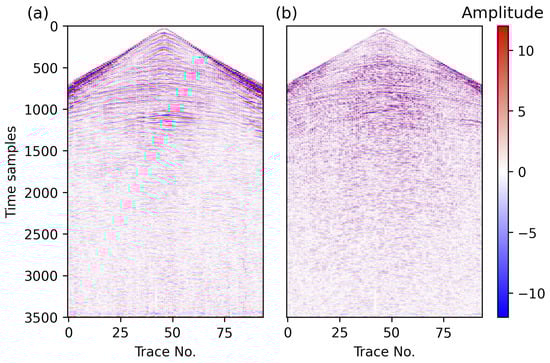 We generate a total of six clean–noisy data pairs by setting different combinations of values for and and then perform numerical experiments under two denoising orders. The network parameters are all set with reference to Section 3.1. The SNRs before and after denoising are shown in Table 3. Denoising order I means that the noise associated with the X-component is removed first, followed by the noise associated with the Y-component, and order II is reversed. These results show that both denoising orders improve the SNRs of the data in various scenarios. Additionally, the proportion of noise leakage associated with each component is stronger, achieving better denoising results by removing the noise first. At the same time, this is also related to the energy strength of the two horizontal components themselves. Overall, removing the component that leaks stronger noise first can achieve better denoising results. For the field data, we cannot know the proportion of noise leakage. By comparing the data, we can roughly see that the energy of the noise related to X-component is slightly stronger than that of the Y-component (seen in Figure 11). Therefore, for field OBN data, we choose to remove the noise related to the X-component first and then remove the noise related to the Y-component.
