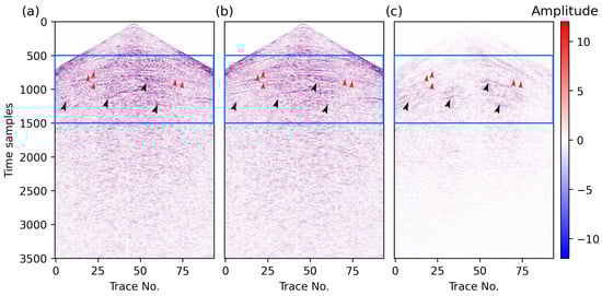 Field data example. (a) Raw Z-component data. (b) Denoising result by the proposed method. (c) Predicted noise by the proposed method. The blue rectangular areas are seismic data from time sampling points 500–1500. Black arrows point out several obvious noise and red arrows indicate signals.