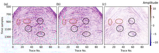 To analyze the denoising results, we plot the original Z-component data and the denoising results by applying the proposed deep learning method for shear wave noise attenuation in Figure 7. Black arrows point out much obvious noise, and red arrows indicate signals. Figure 7b,c show the denoising results and predicted noise by the proposed method. The blue rectangle of the noisy Z-component is where the noise amplitudes are large. The noise overlaps the signal and even masks the valid signal. The proposed method in this paper effectively suppresses the shear wave noise. The magnified display results of the data corresponding to the blue rectangles in Figure 7 are shown in Figure 8. The black and red circles indicate the area where the noise and signal overlap. Our method exhibits effective denoising in these region. Particularly, the red circles highlight that our method achieves signal recovery while denoising. In addition, the continuity of the valid signal is improved.