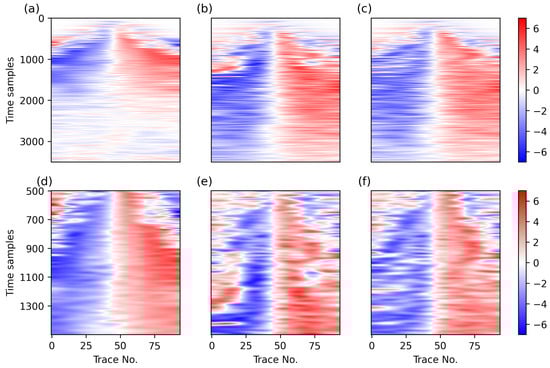 Furthermore, we estimate the local slope using the dip2d function in the Pyseistr package [] to analyze the denoising effect. Figure 10a shows the estimated local slope of the P-component data which are considered as the reference indicating denosing performance. Figure 10b shows the estimated local slope of the raw Z-component data, and Figure 10c shows the result obtained by the proposed denoising method, which better matches the reference. The second row of Figure 10 shows the estimated local slope at time sampling points 500–1500 in the first row, showing more clearly the similarity between Figure 10c and Figure 10a. These results indicate that the proposed method in this paper can remove the shear wave noise with protection of the signal, which verifies the effectiveness of the method.