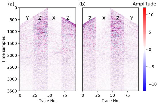 Comparison of the three components of field OBN data. (a) From left to right, the Y-, Z-, X- and Z-component. (b) From left to right, the Z-, X-, Z- and Y-component.