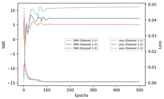 where S is the clean signal and represents the reconstructed data. As we know, a higher SNR means a better quality of data. After denoising, the SNRs of noisy data from Dataset 1-1, 1-2 and 1-3 are improved from 6.55 dB, 0.53 dB, −5.49 dB to 16.12 dB, 13.47 dB, 9.47 dB, respectively, indicating the effectiveness of the proposed method. Table 1 shows the SNRs of the data before and after denoising.