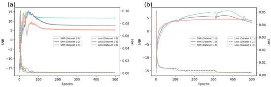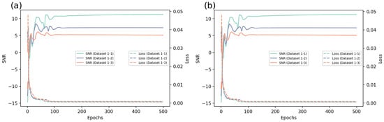 Loss function and SNR curves in network training (learning rate = 0.001). (a) Weight decay = . (b) Weight decay = .