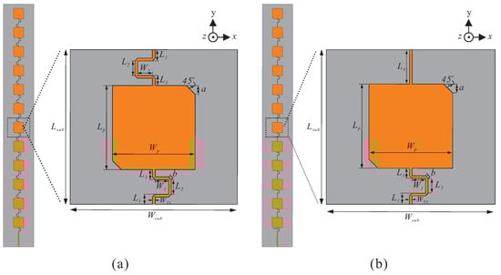 In the beam-tilted antenna configuration (Figure 1a), the transmission lines below and above the patch in the unit cell include U-shaped bends in opposite directions. The U-shaped bends in opposite directions are proposed to reduce the coupling between parallel microstrip lines in a series-fed array arrangement. In contrast, the unit cell of the broadside antenna, described in Figure 1b, contains a U-shaped bend transmission line below the patch and a straight upper transmission line. The U-shaped bend transmission line is chamfered at the corners to reduce losses, enhancing the overall antenna efficiency, as shown in Figure 1a,b.
